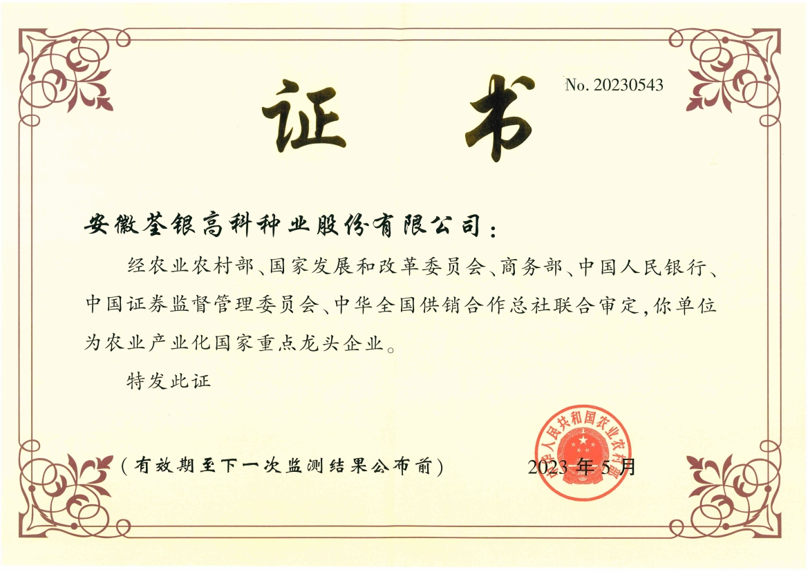 安徽荃銀高科種業股份有限公司是一家“以種業為核心、農業服務為延伸、探索和創新農業多元化發展”的現代高科技種業上市公司,證券代碼:300087。公司注冊資金9.47億元,系“中國種業領軍企業、農業產業化國家重點龍頭企業、國家高新技術企業、農業部首批農作物種子育繁推一體化企業、中國種業信用明星企業"。在國內控股子公司20多家,在國外設立分支機構4家,良種銷售至全國20多個?。ㄊ小^),出口覆蓋20多個國家與地區,種業綜合實力、雜交水稻研發、推廣及海外業務規模均居全國種子企業前2位。